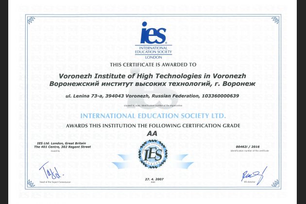 По решению экспертной комиссии IES текущий рейтинг Воронежского института высоких технологий A + (топ учреждение с международным опытом) увеличен до уровня АА (топ учреждение, получившее международное признание и мировую известность).