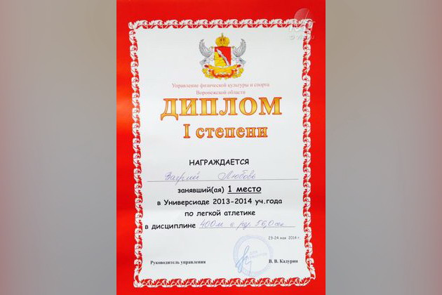 Первое место в универсиаде вузов по легкоатлетическому кроссу на дистанции 400 м.