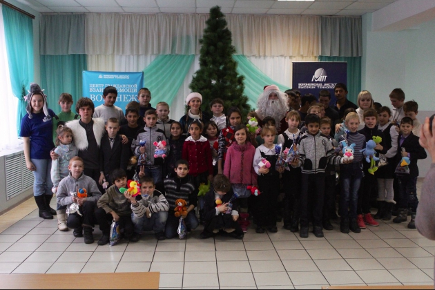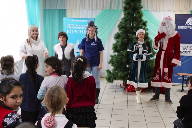 В преддверии Нового года и Рождества студенты ВИВТ и волонтеры ЦГВ-Воронеж поздравили воспитанников школ-интернатов с предстоящими праздниками и провели для них утренники. Это 187 воспитанников государственного областного образовательного учреждения «Бобровская специальная (коррекционная) общеобразовательная школа-интернат VII-VIII вида для детей-сирот и детей, оставшихся без попечения родителей с ограниченными возможностями здоровья», социально-реабилитационного центра для несовершеннолетних "Надежда" и Бутурлиновской специализированной (коррекционной) школы-интернат 8 типа. Дед Мороз и Снегурочка поздравили ребят с наступающими новогодними праздниками, Старичок – Годовичок поиграл в подвижные игры с девчонками и мальчишками, ну а завершился праздник веселым хороводом и вручением сладких подарков и игрушек. Выражаем благодарность воронежской благотворительной организации «Общие дети» за предоставленные сладкие подарки.