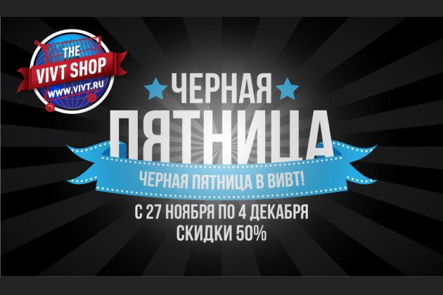 ХОРОШАЯ НОВОСТЬ! Мы присоединяемся к черной пятнице и снижаем цены в нашем интернет- магазине VIVT SHOP. Только одну неделю с пятницы по пятницу скидки на все товары - 50%. Сроки проведения акции: с 27 ноября по 4 декабря 2015 года. Обращаем ваше внимание на то, что цена в магазине уже указана с учетом скидки. Ждем вас за покупками в магазине VIVT SHOP.