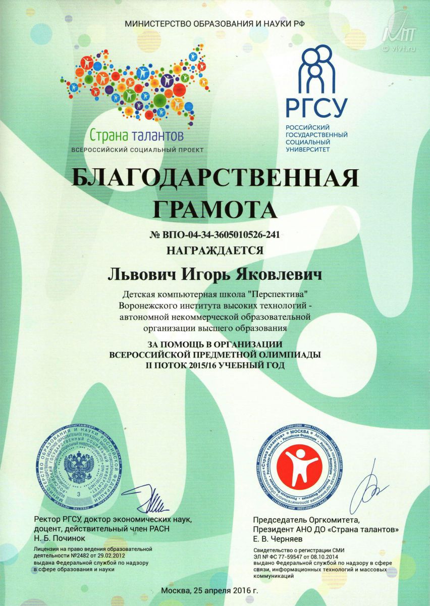 Ректор ВИВТ Львович И. Я. и детская компьютерная школа ВИВТ "Перспектива" получили благодарственную грамоту за помощь в организации всероссийской предметной олимпиады II поток 2015/16 учебного года.