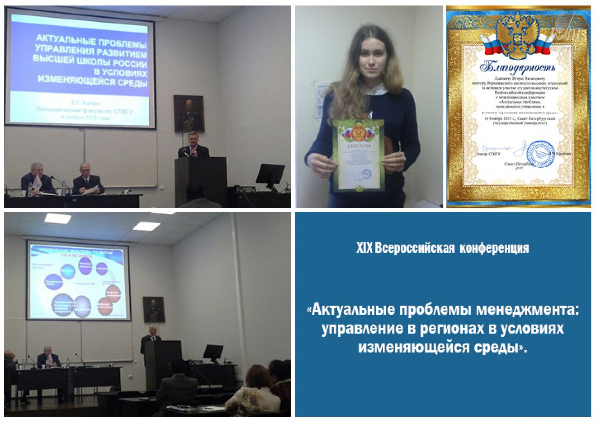 6 ноября 2015 г. в СПбГУ состоялась XIX Всероссийская конференция с международным участием «Актуальные проблемы менеджмента: управление в регионах в условиях изменяющейся среды».Воронежский институт высоких технологий представляла студентка Ирина Гусарова с докладом «О возможностях развития туристической индустрии в регионе».